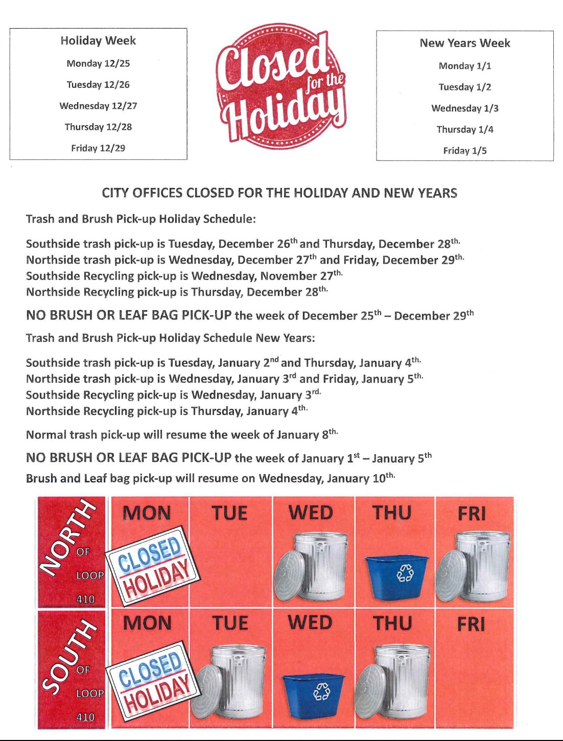 - LEAF BAGS or BRUSH will not be collected on Holiday weeks
