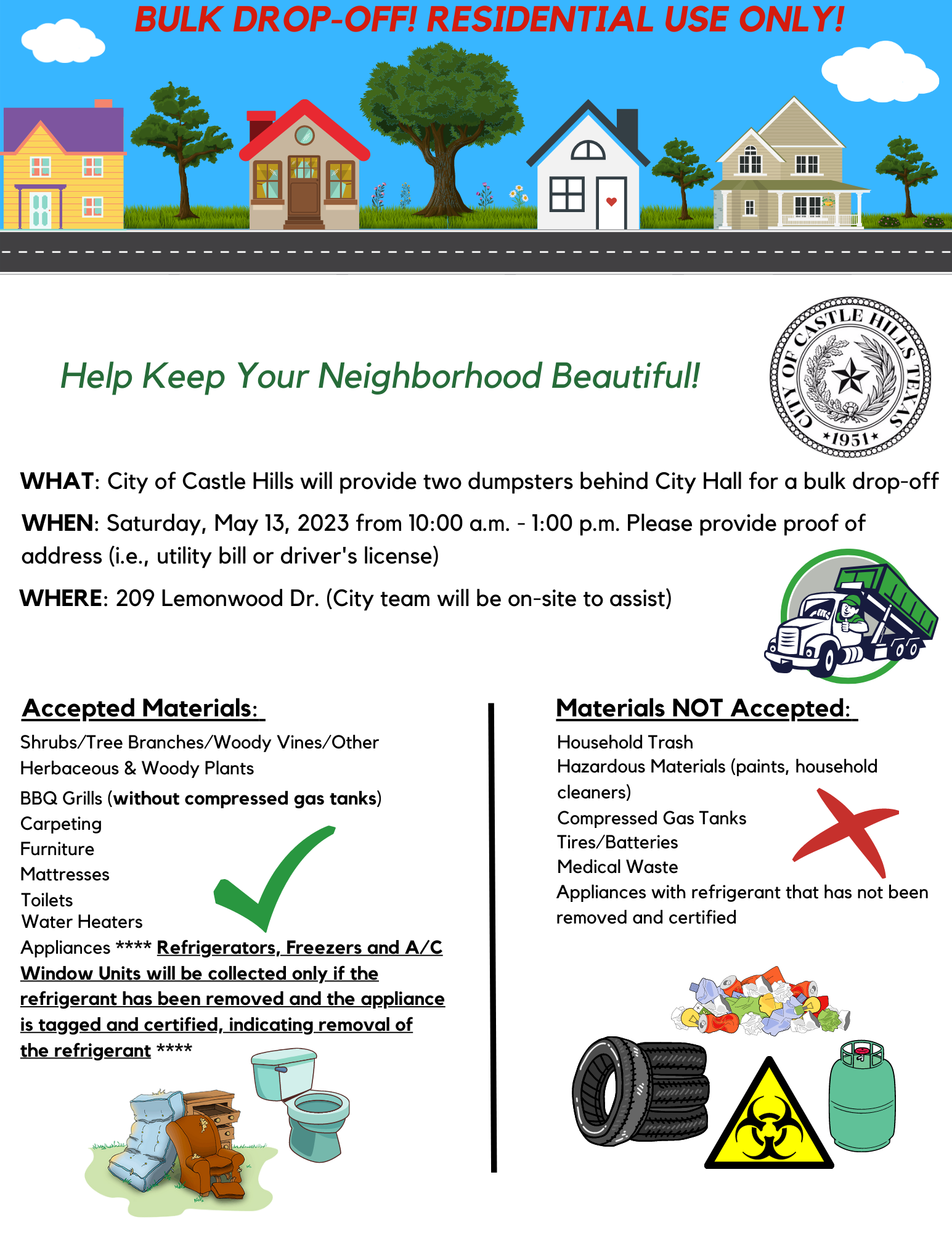 Saturday, May 13th is our Spring bulk/heavy trash drop-off day in Castle Hills.